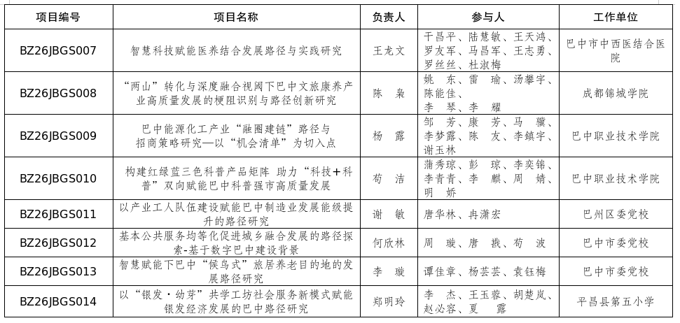 经专家评审、市社科联党组审定,同意对《巴中市“科技+科普”双向赋能机制构建研究》等14项课题予以立项(名单见附件)。